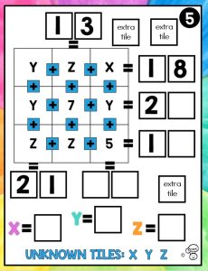 5 - 8 | UNKNOWN TILES: X Y Z DIGITAL finding the value of 3 variables by employing logical and algebraic thinking to addition problems Challenge Level: | $10.00 Max: Min: 1 Step: 1 Add to cart | |