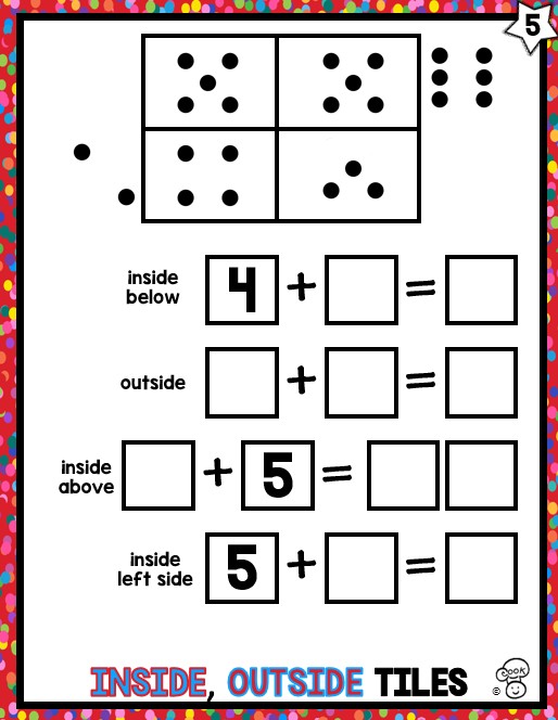 1 - 3 | INSIDE, OUTSIDE TILES forming addition fact equations by visualizing dot patterns and dealing with above, below, inside, outside, left side, and right side Challenge Level: | $15.00 Max: Min: 1 Step: 1 Add to cart | |